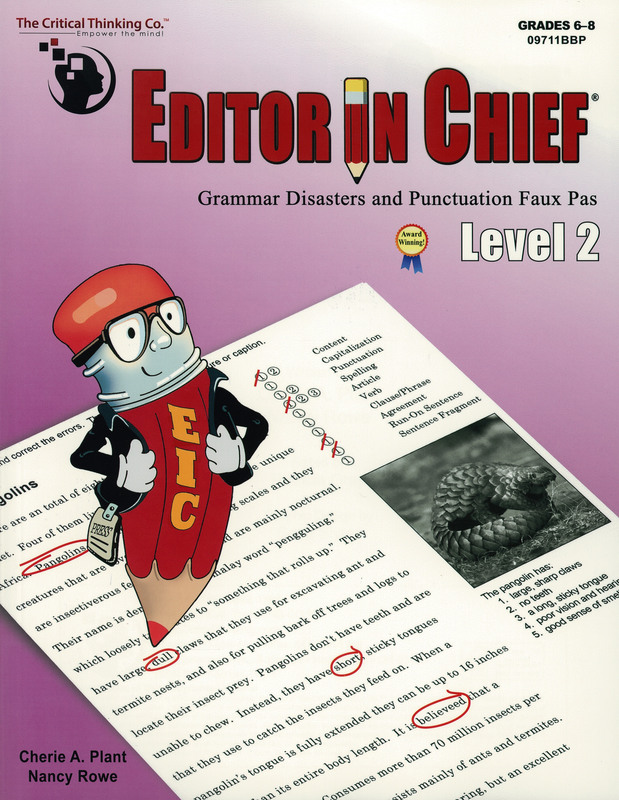 The editing text helps the student edit, which is not the same thing as write, but is the skill tested on a standardized test. Our new Editor in Chief® Level 2 book includes 12 easy-to-understand lessons in grammar and mechanics and 69 activity pages. The lessons include the following: content, capitalization, punctuation, spelling, adjectives, adverbs, articles, conjunctions, prepositions, interjections, pronouns, verbs, clauses, phases, agreement, confused word pairs, negative words, run-on sentences, and sentence fragments. After learning a lesson, students apply the rules by correcting the errors, and reviews provide more challenging practice of the multiple skills already taught. Detailed answers are also included. This is the industry's most highly-effective grammar and mechanical curriculum solution!