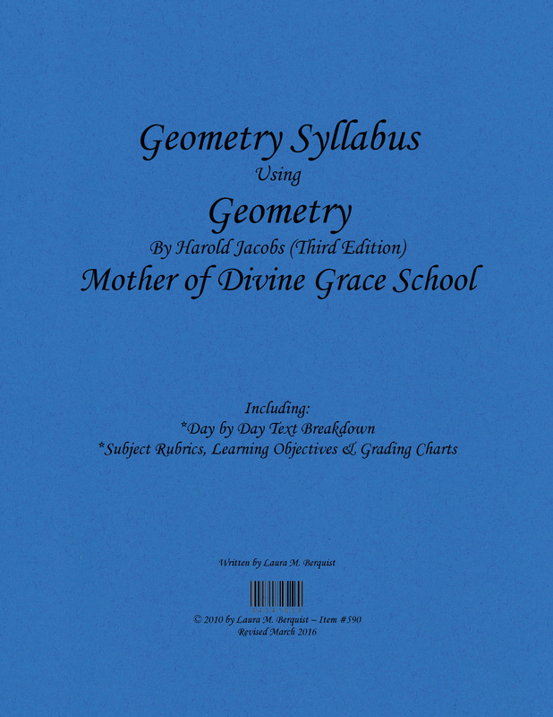 We use Jacob's Geometry by Harold Jacobs which presents the principles of geometry in an orderly manner and reviews the concepts regularly. Jacob’s Geometry incorporates many of the propositions from Euclid’s Elements in a style which is well suited to young students. Jacobs also provides an answer key, quizzes to be used throughout the year, and an answer key for the quizzes. The Geometry Syllabus has a day-by-day breakdown of this course along with a variety of teaching resources including Tenth Grade Subject Rubrics, Learning Objectives, and grading charts. This is a 1 year, 1 credit course.