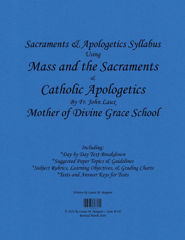 We use Mass and the Sacraments and Catholic Apologetics by Fr. John Laux. These are both excellent texts, with good questions requiring careful analysis of the material by the student. Mass and the Sacraments provides a thorough and precise explanation of the Holy Sacrifice of the Mass, the sacraments, indulgences, and sacramentals. Catholic Apologetics guides the student through well reasoned answers to the classic objections against the faith. The text covers topics such as the existence of God, immortality of the soul, science and faith, reason and revelation, the divinity of Christ, the foundation of the Church and the infallibility of the pope. We also use Beginning Apologetics by Chacon and Burnham to study apologetics from a Biblical point of view. We also include essay and paper topics to give the student practice with writing in variety of styles. The Sacraments & Apologetics Syllabus has a day-by-day breakdown of this course along with paper topics, quizzes, answer keys to the quizzes, and a variety of teaching resources including Tenth Grade Subject Rubrics, Learning Objectives, and grading charts. This is a 1 year, 1 credit course.